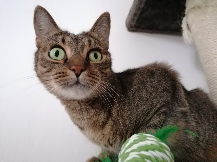 Mew ist die Samtpfote in der Truppe. Anfangs ist sie fremden Menschen gegenüber recht schüchtern, mit Geduld kann man aber ihr Herz erobern und wird zum Rückenkraulen aufgefordert.